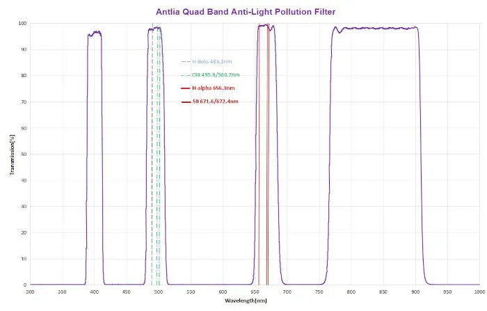 The Antlia "4-band" filter is designed to suppress a significant portion of light pollution for one-shot color cameras (OSCs), such as color astrophotography cameras, digital cameras, and monochrome cameras. Antlia proposes preserving four major emission lines: H-Beta (486.1 nm), OIII (495/500 nm), H-Alpha (656.3 nm), and S-II (672 nm), with narrowed bandwidths. Additionally, a 400 nm (blue) region helps maintain good color balance. A wide area in the near-infrared (NIR) from 760 to 920 nm is included due to the high sensitivity of current cameras in this spectral region.